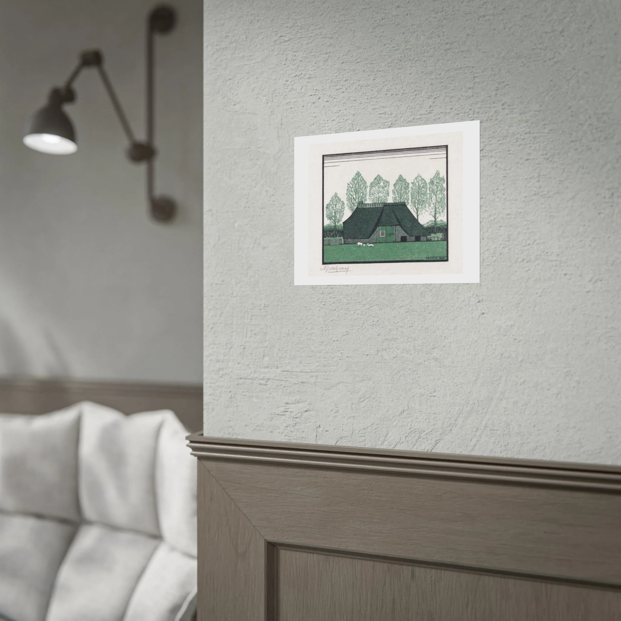 Invoke the rustic charm of the Dutch countryside through the lens of early 20th-century modernism with this Julie de Graag "A Thatched Farm" art print. Executed in 1919, this vintage woodcut captures the architectural essence of rural life with the artist’s signature Graphic Art Nouveau precision. De Graag masterfully utilizes bold, rhythmic linework and deep monochrome contrast to define the heavy, thatched roof and sturdy structure of the farmhouse. This minimalist landscape woodcut transcends traditional pastoral art, offering a structured and intellectually chic aesthetic that complements Japandi, farmhouse modern, or minimalist interiors. As a museum quality print, it serves as a powerful testament to de Graag’s ability to find geometric beauty in everyday surroundings, making it a sophisticated addition to any curated collection.