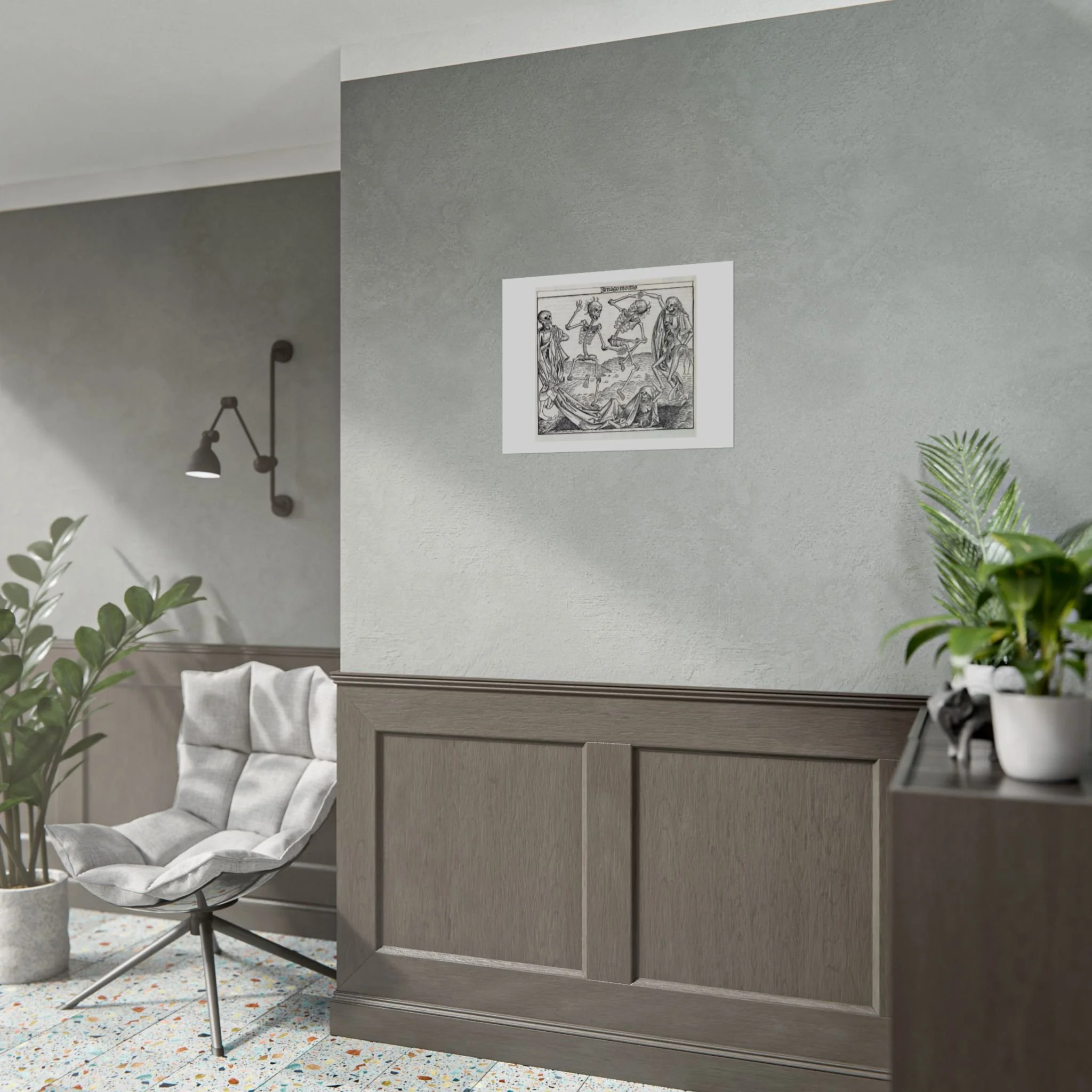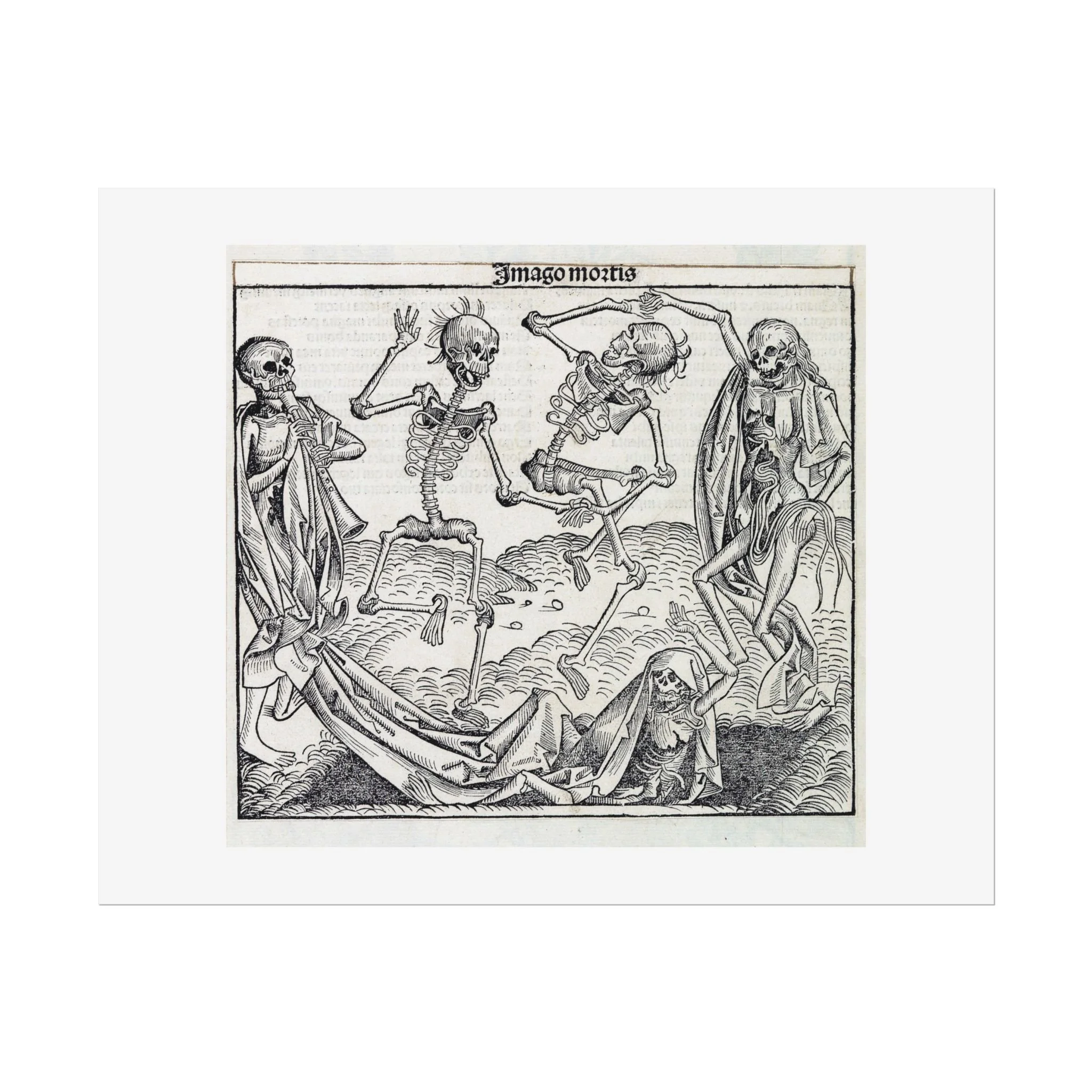 Step back into the late Middle Ages with this hauntingly beautiful print of Imago Mortis, the legendary "Dance of Death." Originally published in the 1493 Nuremberg Chronicle, this iconic woodcut was created by the masters Michel Wolgemut and Wilhelm Pleydenwurff in the very workshop where a young Albrecht Dürer apprenticed.
